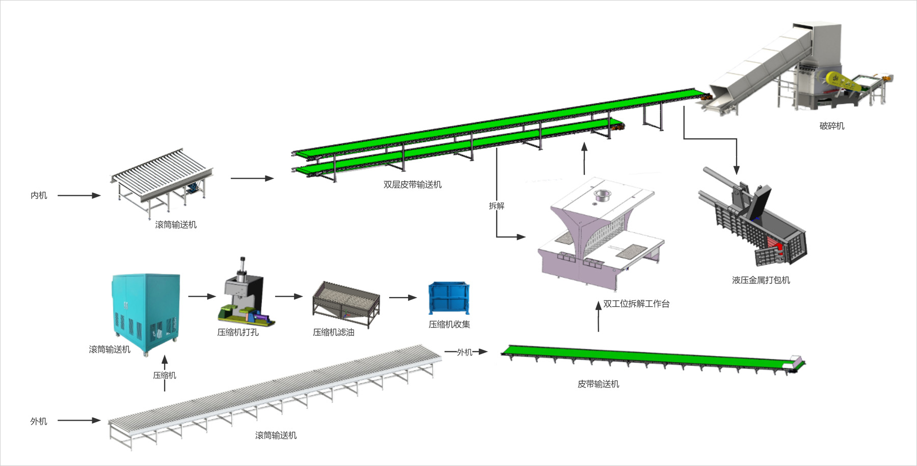 众所周知电子垃圾是一种对全球环境的威胁,此前传统的处理方式是送到垃圾填埋场进行处理,可能会发生各种不同化合物和元素的泄露,这些都会污染地下水。而现在,随着废旧家电回收生产线的产生,电子垃圾得到了有效的回收处理。废旧空调属于可回收垃圾,在再生资源回收与循环利用的大环境下,我们生产了一整套的废旧空调拆解破碎生产线。可快速有效的回收废旧空调里的可利用资源。废空调拆解平台采用新拆解技术,实现废旧空调拆解再利用;拆解过程无废气废水产生,无粉尘泄露,符合国家环保要求。